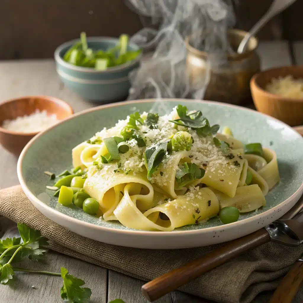 - Assemblez : Égouttez les pâtes, réservez un peu d’eau de cuisson. Mélangez aux poireaux. Ajustez la consistance avec l’eau réservée.